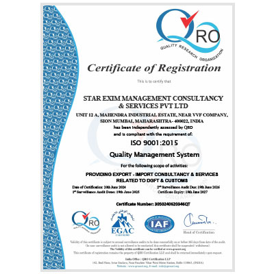 Star Exim Management Consultancy & Services Pvt. Ltd. is certified to ISO 9001:2015 – Quality Management System.