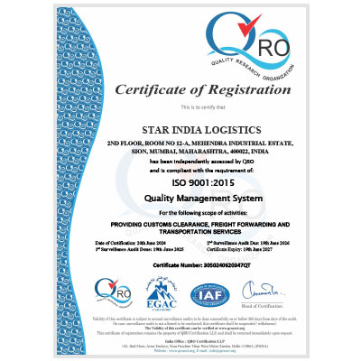 Star India Logistics holds ISO 9001:2015 – Quality Management System certification.