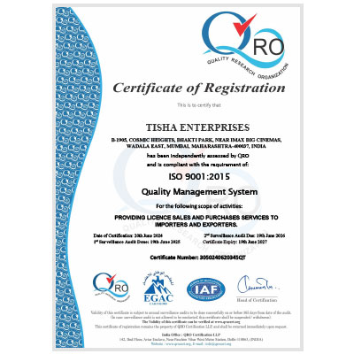 This certification applies to our licence sales and purchase services for importers and exporters, an area where precision and compliance are essential.